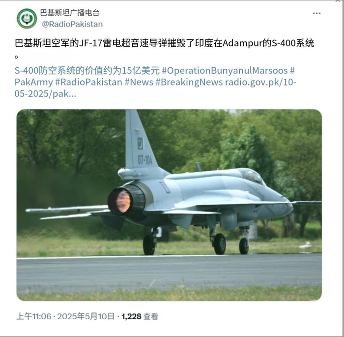在歼10击落法国阵风战斗机后,中巴联合研制的枭龙战斗机,也创下最新战绩,摧毁了俄制S400防空导弹系统,此前俄制苏30战斗机已经被击落。与此同时,印度的数十架以色列无人机,也在袭击巴基斯坦的时候被击落。巴基斯坦方面消息称,他们还击落了一架印度战机,飞行员被当场俘虏。