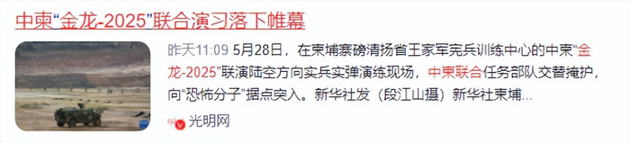 5 月 28 日,中柬 “金龙 - 2025” 联合演习快结束时,柬埔寨和泰国就在边境打起来了。