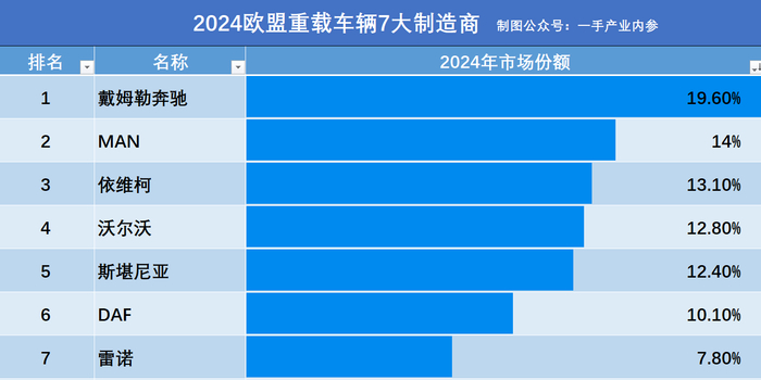 另附:2024年欧盟重载客车制造商市场份额排名,数据源于:ICCT。