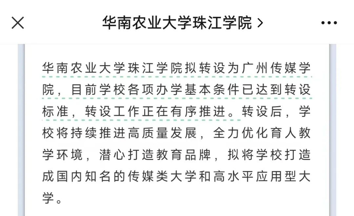 其中,华南农业大学珠江学院拟转设为广州传媒学院,目前学校各项办学基本条件已达到转设标准,转设工作正在有序推进。