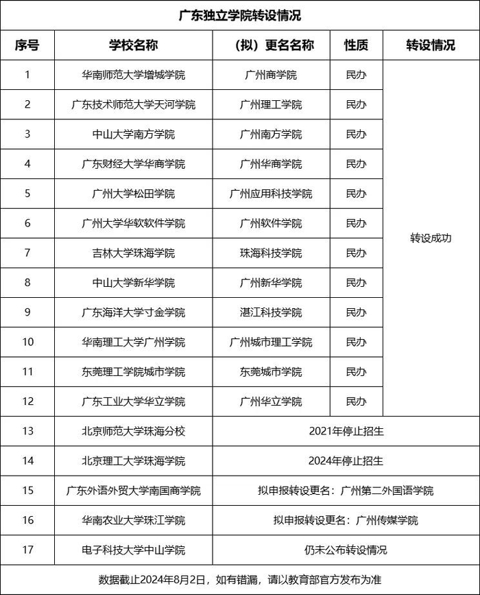 根据教育部规定,所有独立学院都将进行转设。广东共有17所独立学院,其中12所院校已完成转设更名,2所停止招生。目前,还有3所暂未完成转设。