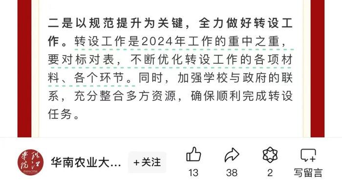 转设工作是2024年工作的重中之重,要对标对表,不断优化转设工作的各项材料、各个环节。同时,加强学校与政府的联系,充分整合多方资源,确保顺利完成转设任务。