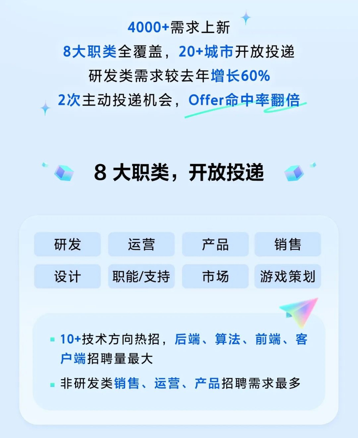 招聘职类:研发、运营、产品、销售、设计、职能/支持、市场、游戏策划。