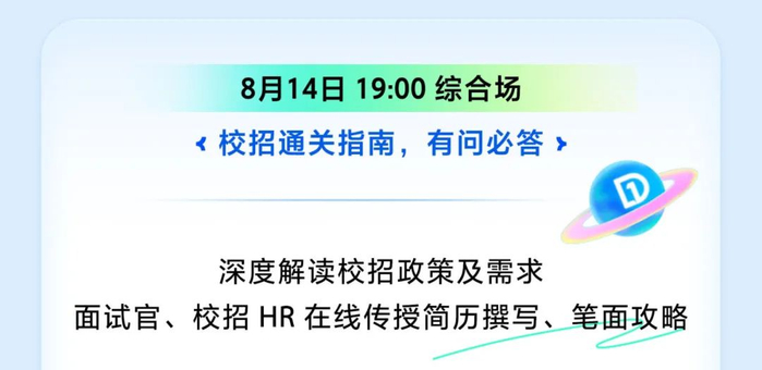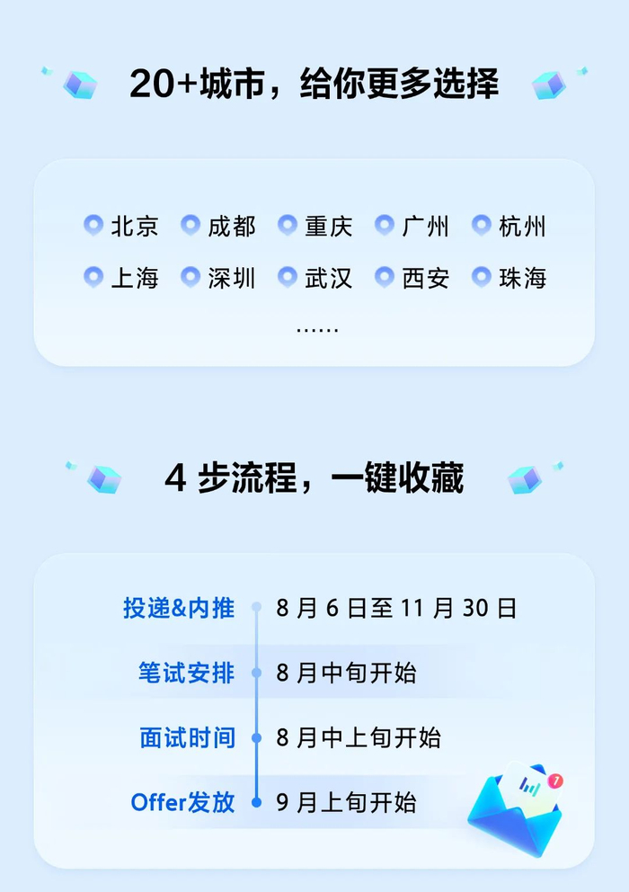 招聘程序:投递&内推(8月6日-11月30日)→笔试安排(8月中旬开始)→面试时间(8月中上旬开始)→Offer发放(9月上旬开始)。