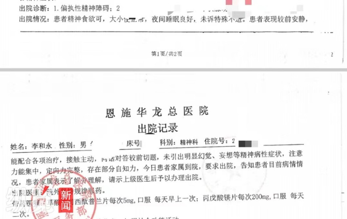 李和永告诉纵览新闻记者,他和母亲于7月22日同时出院,相关工作人员称他患有偏执性精神障碍,因此要继续吃药。记者在李和永提供的恩施华龙总医院出院记录看到,出院诊断为偏执性精神障碍,出院情况则写到,患者精神食欲可,大小便正常,夜间睡眠良好,未诉特殊不适。患者表现较前安静,能配合各项治疗,接触主动,问话对答较前切题,未引出明显幻觉、妄想等精神病性症状,注意力能集中,定向力完整,存在部分自知力。患者家属到院,要求出院,告知患者目前病情情况,患者家属表示了解并理解,请示上级医生后予以办理出院。出院后应坚持规律服用草酸艾司西酞普兰片和丙戊酸镁片。据了解,前者用于治疗抑郁、焦虑,后者是一种抗癫痫与抗躁狂药物。李和永称,他自己去了他认可的医院进行检查,结果为没有相关疾病,不需服用精神药物。记者希望他能出示相关诊断证明,他表示了拒绝,认为将相关诊断证明公开的时机未到。