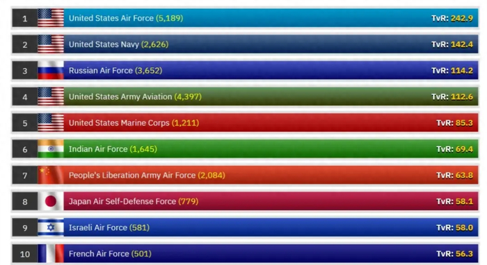 这个排名是由WDMMA网站发布的,它考虑了多个方面的因素,包括军用飞机的总数、现代化程度、后勤维护水平、攻击和防御能力。