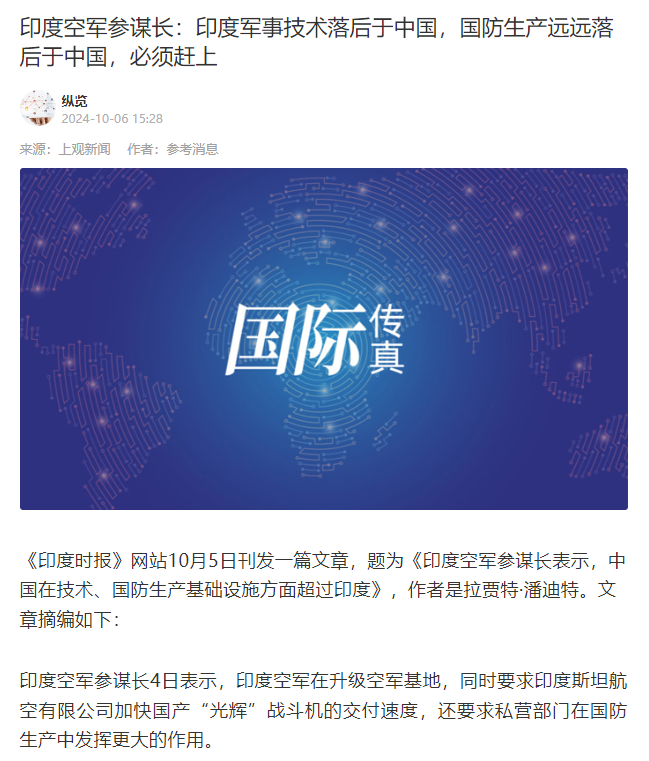 信息来源:上观新闻 2024-10-06 《印度空军参谋长:印度军事技术落后于中国,国防生产远远落后于中国,必须赶上》