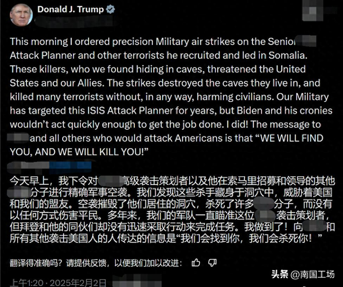 特朗普选择在这个时间段这么做,肯定有原因的。实在是没想到,特朗普“二进宫”之后。第一次实打实的海外进攻,居然是去打索马里。