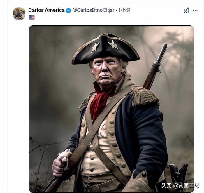 支持特朗普的美国网友表示:“我爱这个男人”,“特朗普2.0正在实现目标!历史上没有一位总统有如此火爆的开局!黄金时代将是无与伦比的!”同时还把特朗普打造成为了,一名美国独立战争时期的,美国“大陆军”战士。
