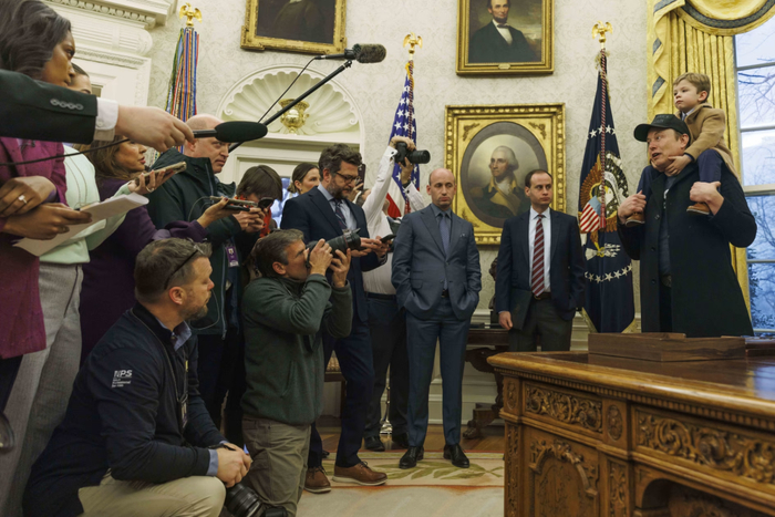今年2月,马斯克带着儿子“X”在椭圆形办公室。图片来源:亚伦·施瓦茨(Aaron Schwartz)/CNP/Zuma Press