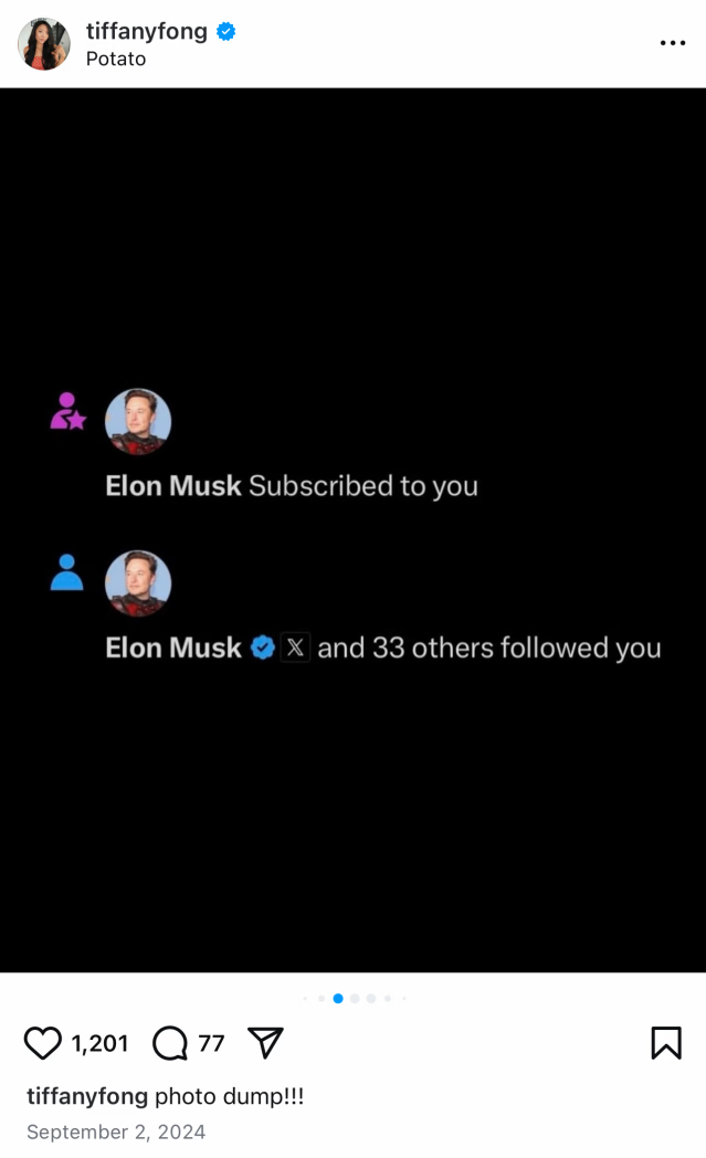一张Instagram帖子显示埃隆·马斯克关注了蒂芙尼·方的账号。