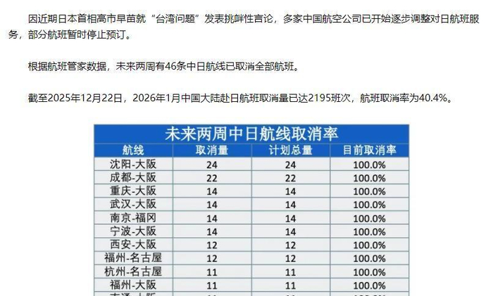 截至2025年12月22日,2026年1月中国大陆前往日本的航班,取消率为40.4%。