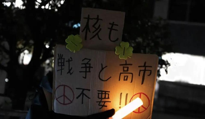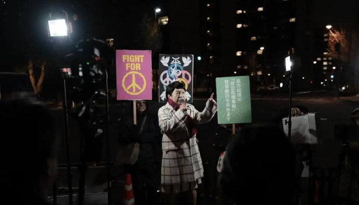 2025年12月23日晚,日本民众在高市官邸前举行抗议活动,社民党党首福岛瑞穗挺立在抗议队列最前方,身后是数千名高举“反对战争”“立即下台”标语的民众。