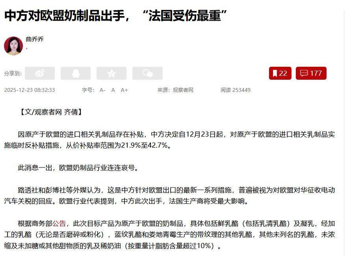 近日,根据相关的媒体报道,就在12月23日,中国商务部发布了一则公告,公告的内容则是,对原产于欧盟的进口相关乳制品实施临时反补贴措施,范围从21.9%到42.7%之间。