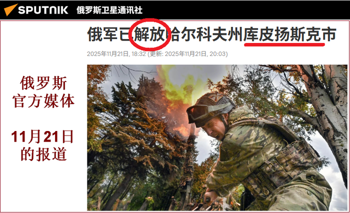 查阅俄罗斯官方媒体的报道,早在今年11月21日,俄军就宣称已经“解放”了库皮扬斯克。