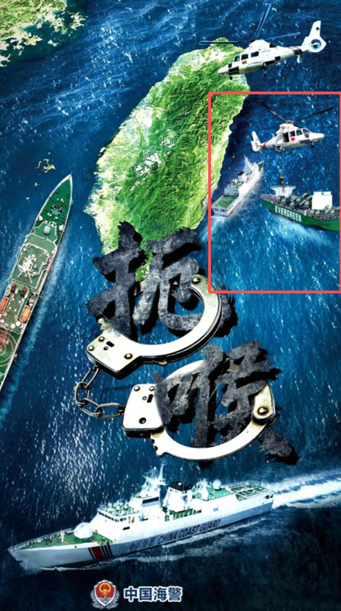 海报细节满满,多艘海警船环绕台湾岛巡航,而在台湾以东海域,一艘长荣海运货轮被拦截,中国海警的直-9舰载机悬停上空,执法人员通过绳索降落到货轮甲板进行登船检查。货轮上装载的,正是美制“海马斯”远程火箭炮系统。