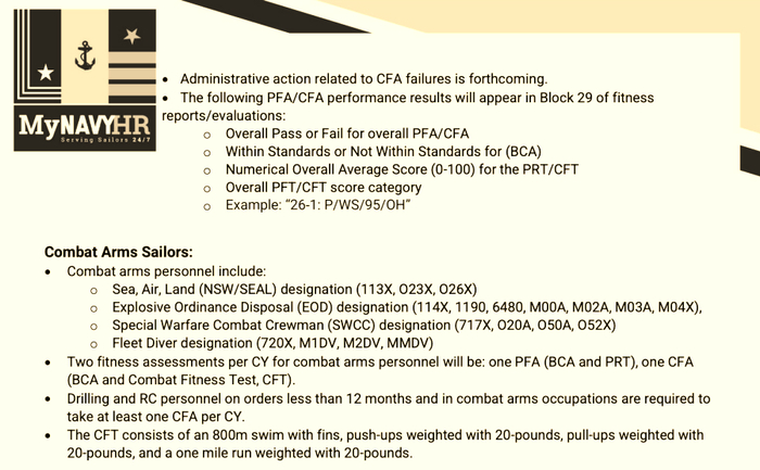 海军四大战斗类职业领域的水兵现在必须每年接受游泳测试,随后穿着20磅(约9.07公斤)负重背心进行跑步及一系列传统力量测试。