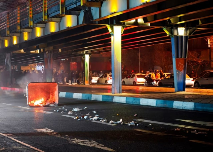 1 月8日,伊朗德黑兰骚乱期间一个燃烧的垃圾箱。据美国有线电视新闻网报道,周三,七国集团(G7)外长发表联合声明,向伊朗发出严厉警告。加拿大、法国、德国、意大利、日本、英国和美国的外交部长共同谴责伊朗当局对人民的“残酷镇压”,并表示如果暴力、杀戮和任意逮捕不停止,将采取“额外的限制措施”。