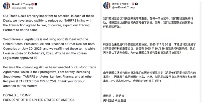 美国总统唐纳德·特朗普1月26日在社交媒体上宣布,由于韩国国会尚未批准两国于2025年7月30日达成并于同年10月29日特朗普访韩期间重申的贸易协议,他将对韩国进口的汽车、木材、药品以及其他商品的对等关税从15%提高至25%。特朗普强调,美国已迅速履行协议条款降低关税,并期待贸易伙伴同样行动。他指责韩国立法机构拖延批准该“历史性”协议,这是其权力范围内的事宜。
