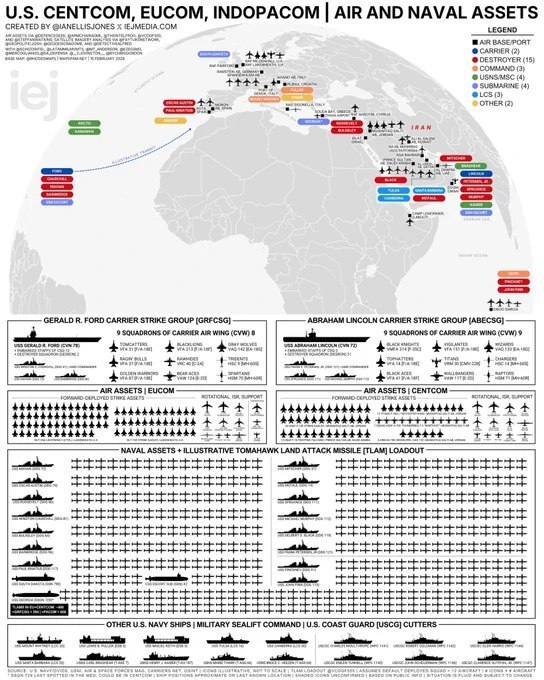 最新军事地图(由军事分析人士@ianellisjones等基于公开来源绘制)显示,美国正对伊朗实施大规模军事集结,动用了中东司令部、欧洲司令部、印太司令部三大司令部的海空资产,总量约占美海军当前全球部署舰艇的三分之一。