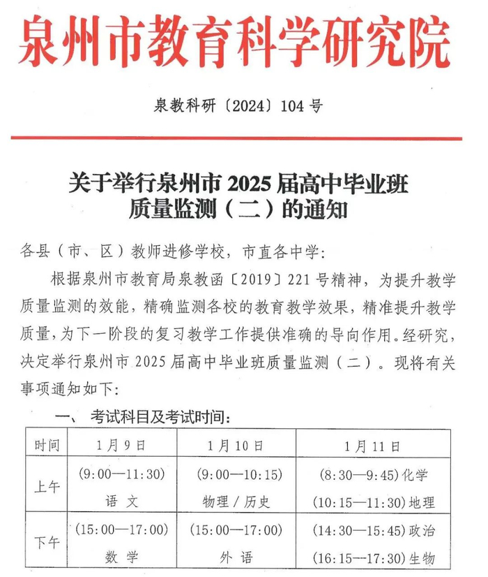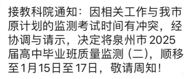 据最新消息,原定于2025年1月9日的泉州高三期末考推迟到1月15日-17日进行,你收到通知了吗?