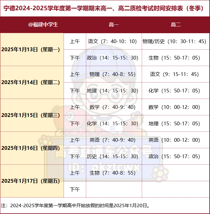 12月即将结束,距离寒假越来越近的同时,各地市高中期末考也如约而至。今天,福建中学生整理了各地市2024-2025年第一学期期末考时间,来看看谁最先考完放假吧!