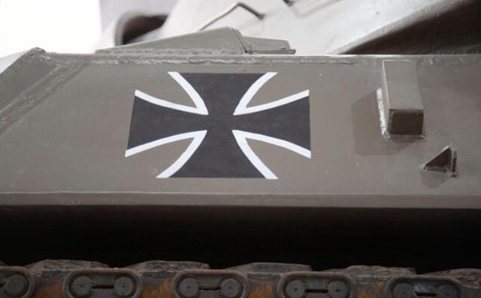 下图是联邦国防军的豹2A6坦克的标志,样式是黑色十字加上白边,十字臂向内倾斜,类似于联邦国防军的标志。