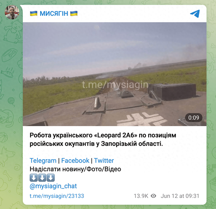 2023年6月12日乌克兰议员在网上发布了一条视频截图,图中是一张坦克截图,上面文字是“乌克兰的豹2A6坦克在被俄罗斯占领的扎波罗热地区进行作战”。