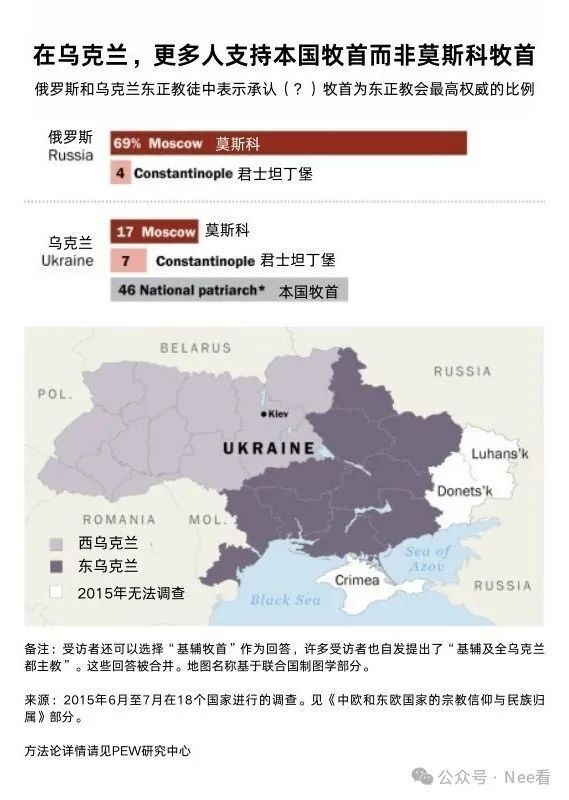 民意调查:根据皮尤研究中心(Pew Research Center),乌克兰东部亲俄地区的东正教徒更倾向支持俄罗斯,而西部天主教徒和OCU信徒则强烈反俄。