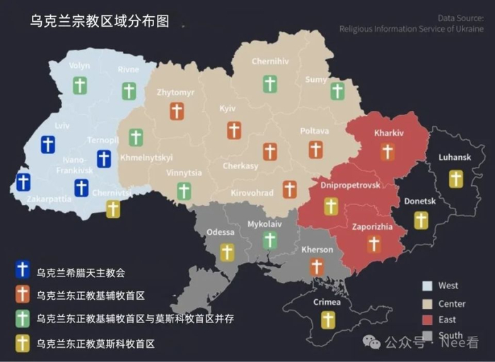 西部:天主教影响深远,尤其是“乌克兰希腊天主教会”(Ukrainian Greek Catholic Church,UGCC),信徒虽少,却象征着亲西方的文化倾向。