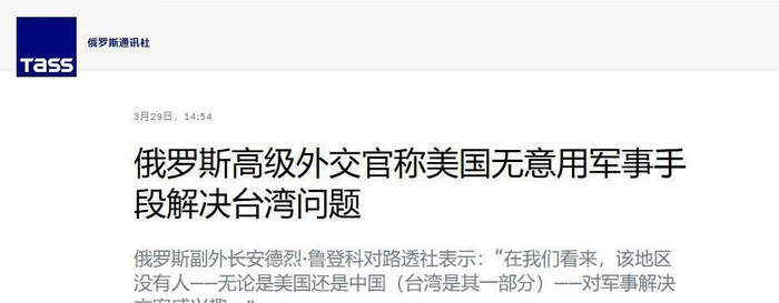 据俄罗斯通讯社报道,3月29日,俄罗斯副外长鲁登科认为中美双方都对军事解决台湾问题不感兴趣,并将台海紧张局势归因于“人为因素”。