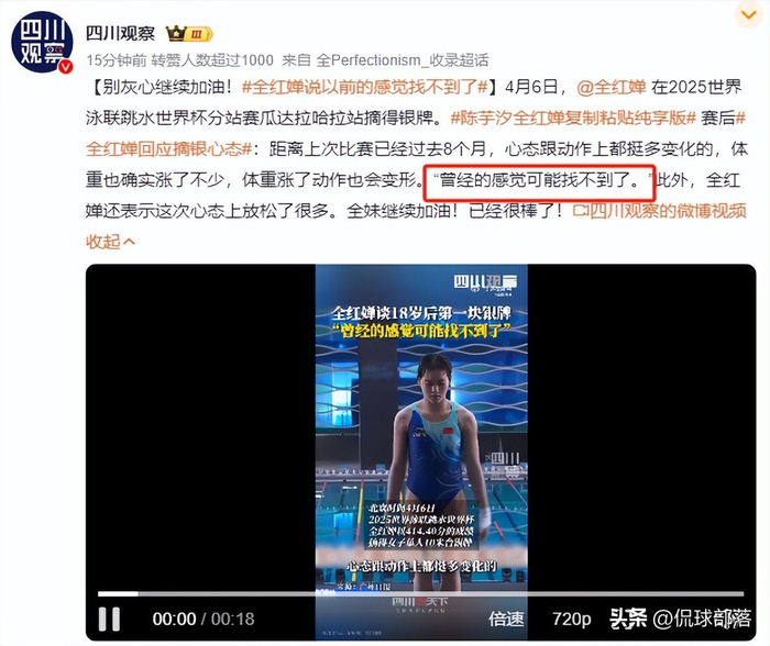 面对这种情况,最终央媒看不下去了,在4月7日的时候,直接发出了全红婵比赛视频,告知所有人此次全红婵失利是因为体重变化导致动作不规范才失误的。