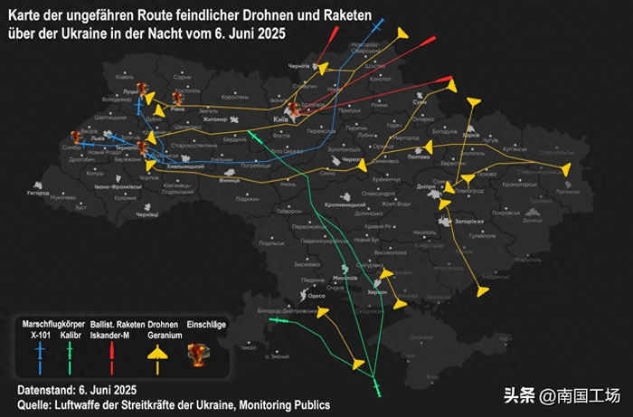 当地时间2025年6月6日,俄罗斯武装部队海陆空三军,对乌克兰全境,特别是乌克兰西部,乌克兰首都基辅地区,实施了大轰炸。这是乌克兰安全局袭击和破坏俄罗斯铁路,发射100多架FPV自杀式穿越机袭击俄罗斯空天军五大战略轰炸机基地,两次突袭克里米亚大桥之后,俄军发动最为猛烈的一次轰炸报复行动。