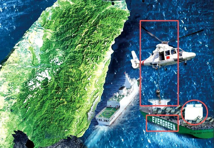 在海报中大陆直升机声索直接垂降一艘名为“长荣”(EVERGREE)的货轮,这艘货轮上满载“海马斯”火箭炮,在大陆登船后该船船头出现一张空白的白色清单,暗示着“海马斯”火箭炮清单清零。
