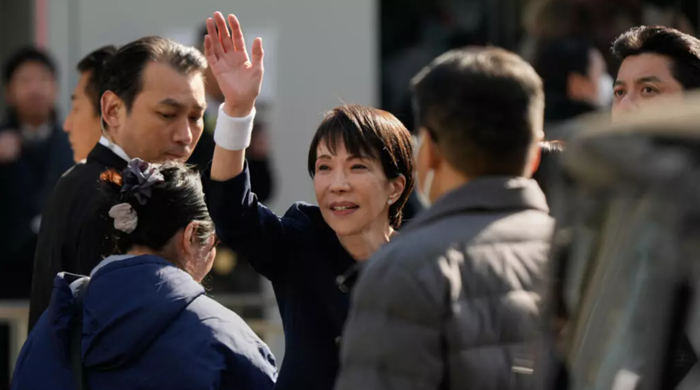 2026年1月27日星期二,日本首相兼执政党——自民党总裁高市早苗(中)在东京与日本革新党联合举行竞选集会,向民众致意。 © Eugene Hoshiko / AP
