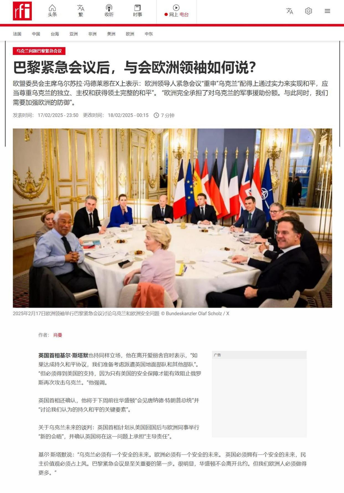 2月17日,法国总统马克龙迅速召集多国首脑召开紧急会议,以应对这一突发情况。包括德国、英国、意大利、波兰、西班牙、荷兰和丹麦的领导人,以及欧盟委员会主席、欧洲理事会主席和北约秘书长,均出席了此次会议。会议的焦点是如何应对美国可能的撤军,以及俄乌停战后欧洲的防务策略。