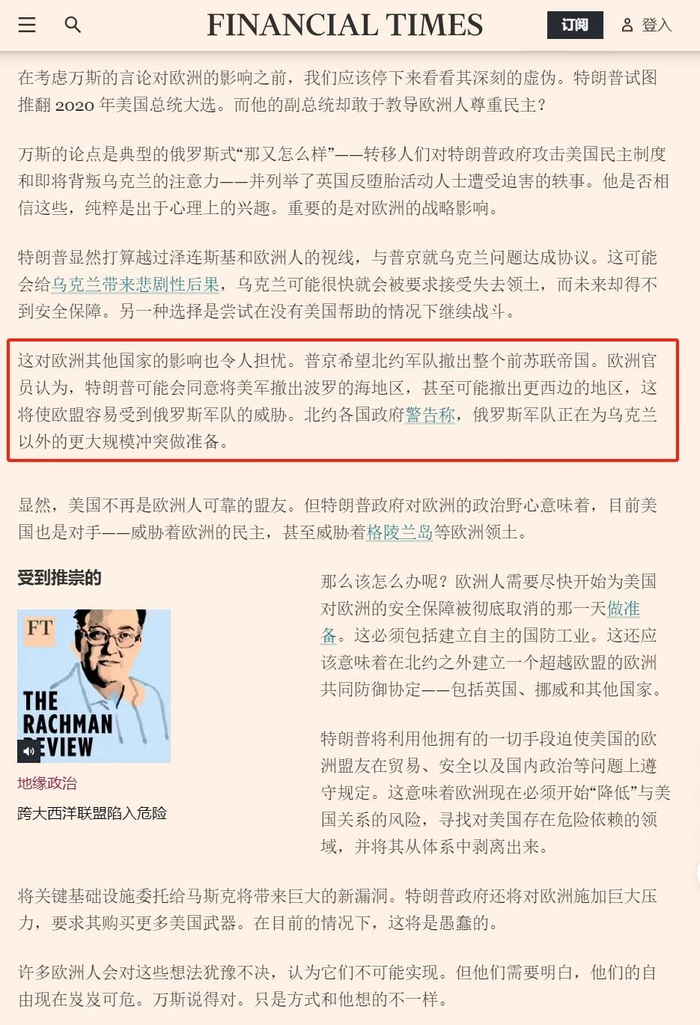不仅如此,英国《金融时报》指出,美国的撤军范围可能不仅限于波罗的海三国,还可能涉及更西部的地区,如波兰或罗马尼亚。这意味着,欧洲将不得不自行承担防务责任,而一直以来依赖北约保护的欧洲国家,如今面临前所未有的挑战。