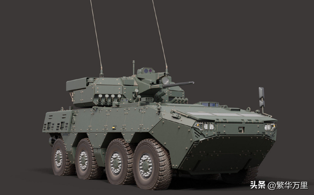 炮塔上,安装了安装了激光测距仪、热成像仪、横风传感器等电子设备,属于标配。从目前公布的各种照片和视频来看,第三代轮式步兵战车的战斗全重,明显高于09系列步兵战车,大约25吨到30吨之间,可能会接近30吨。因为从整个框架设计来说,明显更加“丰满厚重”。