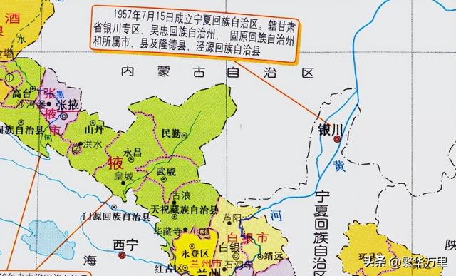 同时,原宁夏省下辖的额济纳旗、阿拉善旗、磴口县等地,划入了内蒙古自治区管理。所以说,在1955年版本的我国地图上,没有宁夏省。同时,甘肃省的北部,多出了一个银川专区。但是,这样的情况,仅仅持续了4年时间。因为,随着发展的需要,民族区域自治的概念,开始进一步推进。