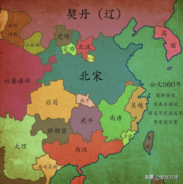 最后,我们聊聊五代十国的复杂局势。从907年唐朝灭亡开始,截止978年,吴越“献土”,中原政权才基本完成了统一。如果从唐朝末期,藩镇混战开始计算,整个中原大地,已经混战了百余年。公正客观的说,北宋并不是传统上的大一统政权,燕云、陇右等地,一直没有收复。理论上说,统一了大部分的唐朝旧土,而不是全部。