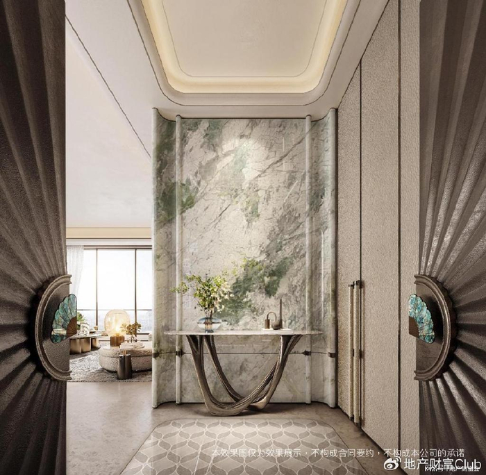 三进归家礼序,重构当代门第气象。总宽约58米奢阔归家大门(仅0708地块,其他大门约36米),采用玫瑰金色金属+奢石+釉面陶板材质,对称水系形成中式礼序归家,奢华恢弘宛若步入艺术馆,世界归来,一步一尊崇。
