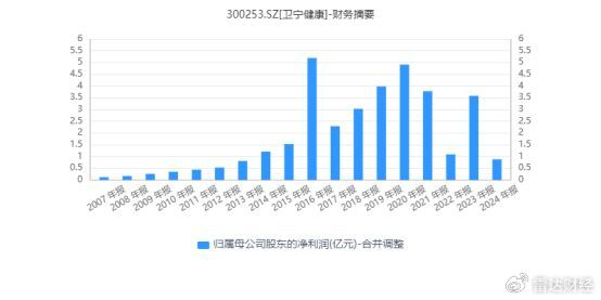2016年,卫宁健康的归母净利润曾达到5.19亿元,然而到了2024年,公司归母净利润仅剩下0.88亿元。