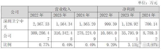 卫宁健康披露的数据显示,卫宁中天2022年至2024年营业收入分别为2367.53万元、1564.34万元和1365.20万元,占公司同期营收比例分别为0.77%、0.49%和0.49%,同期卫宁中天净利润分别为999.39万元、1126.92万元、700.14万元,占公司净利润比例分别为9.20%、3.15%、7.97%。