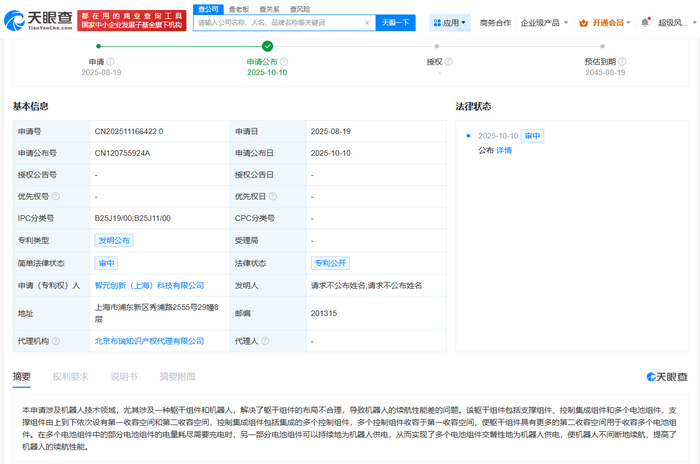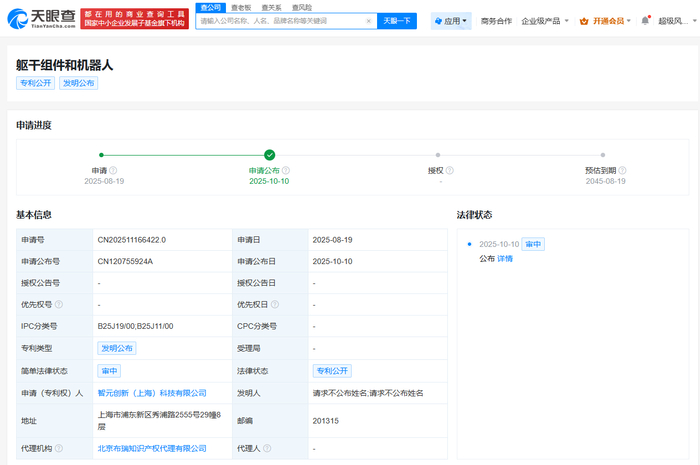 雷达财经讯,天眼查App显示,10月10日,智元机器人关联公司智元创新(上海)科技有限公司申请的“躯干组件和机器人”专利公布。