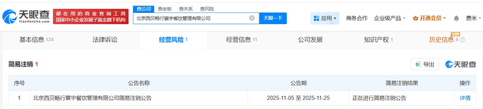 雷达财经讯,天眼查经营风险信息显示,近日,北京西贝畅行寰宇餐饮管理有限公司新增一则简易注销公告,公告期为11月5日至11月25日。