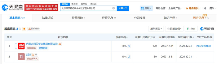 北京西贝畅行寰宇餐饮管理有限公司成立于2020年12月,注册资本200万人民币,经营范围包括餐饮管理、食品销售、棕制品销售等。股东信息显示,该公司由内蒙古西贝餐饮集团有限公司、刘洁共同持股。