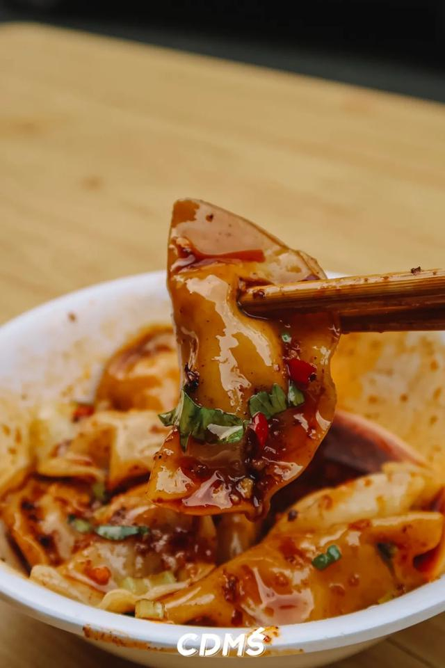 据说老板也曾是钟水饺的退休员工,所以红油水饺味道也很地道老成都味。每早现包的纯肉水饺煮好后,淋上红油和调料,香气直接拉满,不辣,但蒜泥、海椒和香料的味道层层叠叠在口腔中蔓延。