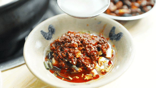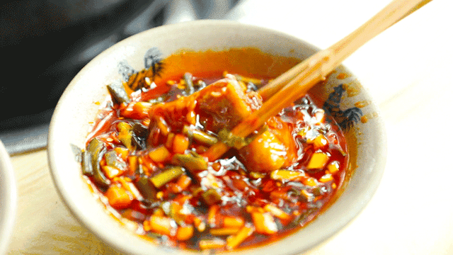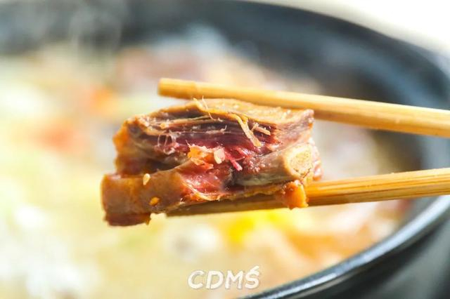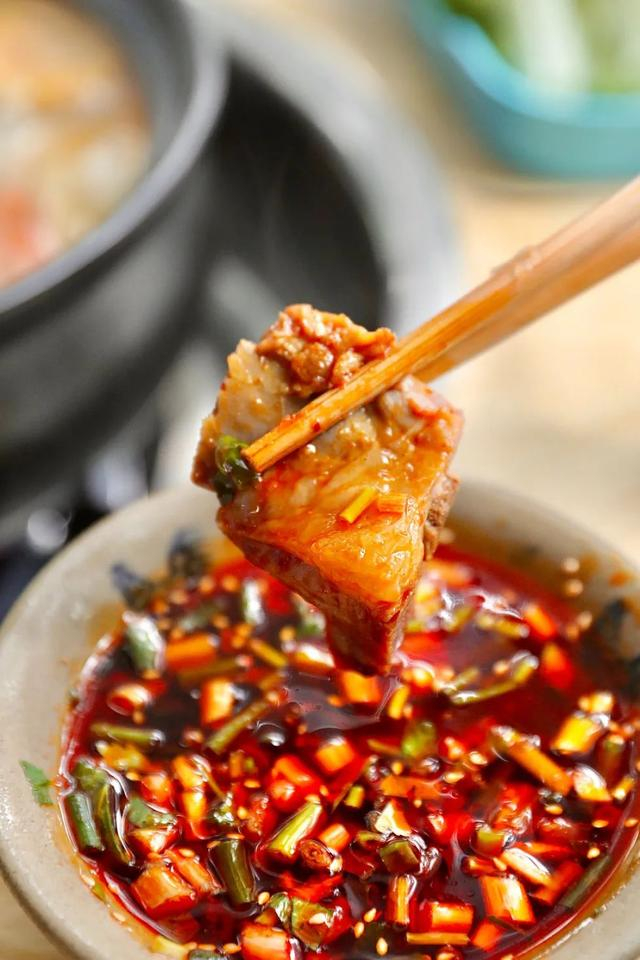 风干的腊排加入水炖煮,不加任何调味,煮好的汤底鲜美又带点腊味。店家秘制的蘸碟加上原汤,立马变成很川式的红油碟。