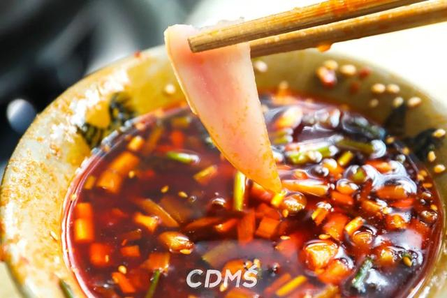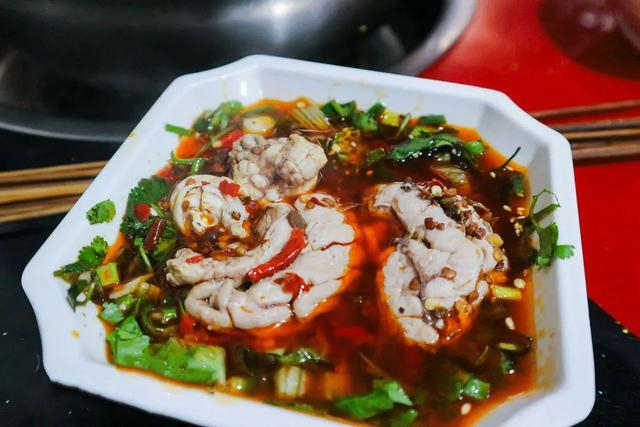 煮好了放到钵钵里,直接吃还算清淡,配上乐山风味碟,加油加辣,增香不少,连很难入味的鸡尖都滑溜溜的,吃着很新鲜。