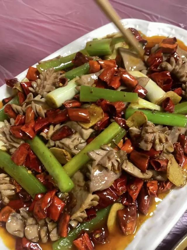 火爆肥肠,先卤后爆炒,长条状的肥肠外皮呈虎皮状,入口干香焦脆,内里的油脂泛着焦香,口感糯香可口,混着干辣椒和青椒的辛辣,下饭极了。